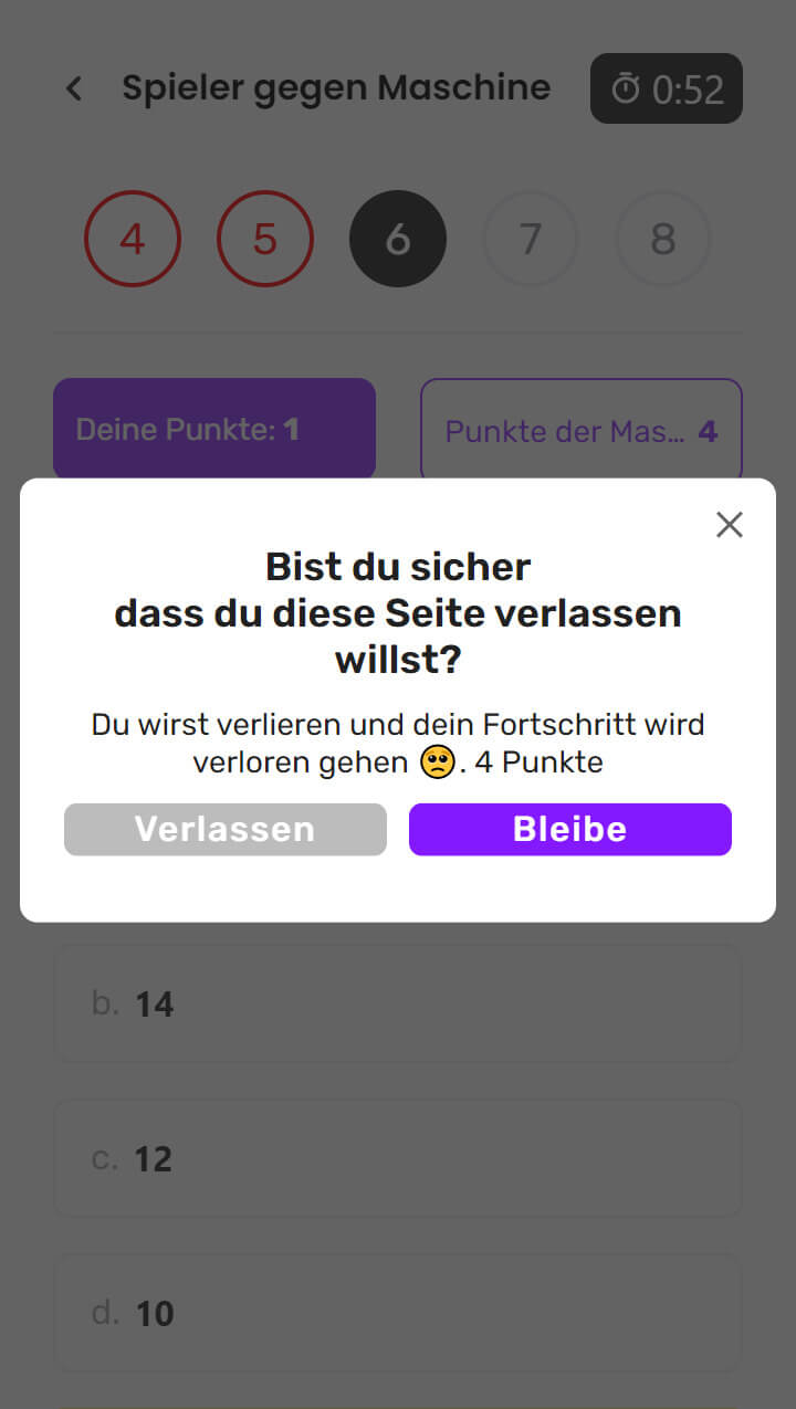 Sie können jederzeit einen Benutzer finden, der Ihr Wissen in einem Einzelwettbewerb mit seinem vergleicht. Sie werden dieselben Fragen beantworten.