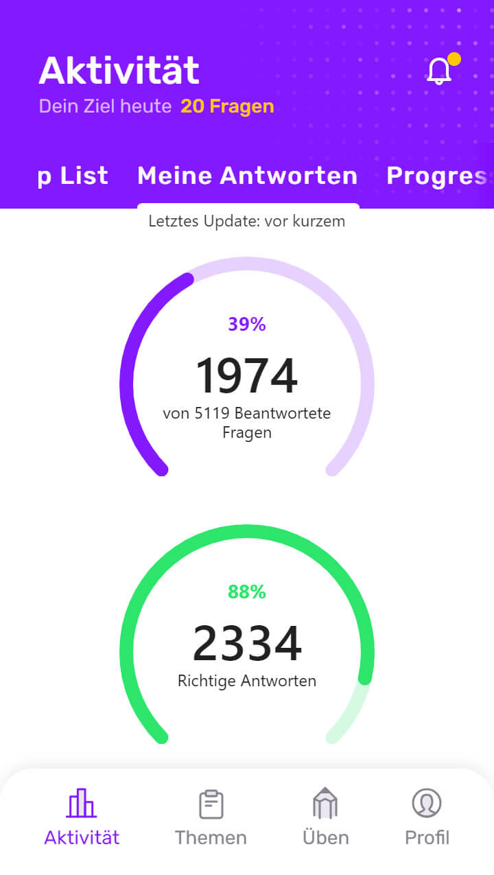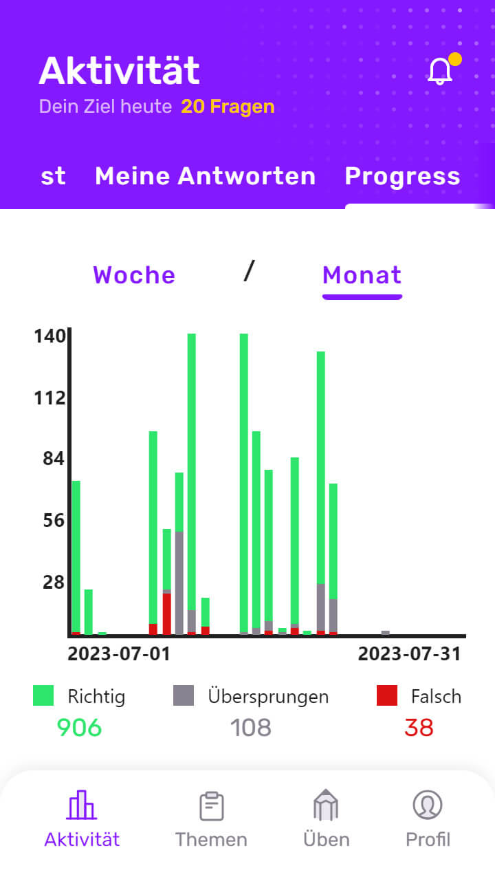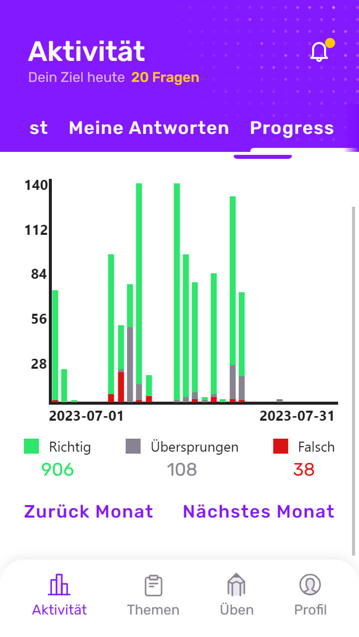 Sie verfügen über zahlreiche Statistikberichte über Ihre bestandenen Übungen und Themen. Sie erhalten wöchentliche und monatliche Diagramme zu Ihren beantworteten Fragen.