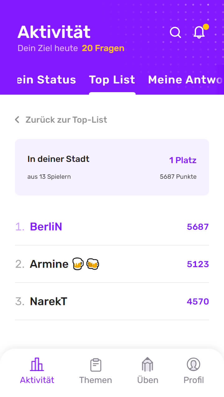 Wir haben Top-Benutzerlisten basierend auf Ihrem Land, Ihrer Stadt, Ihrer Schule und Ihrer Klasse erstellt. Natürlich gibt es auch eine Haupt-Topliste aller Benutzer.